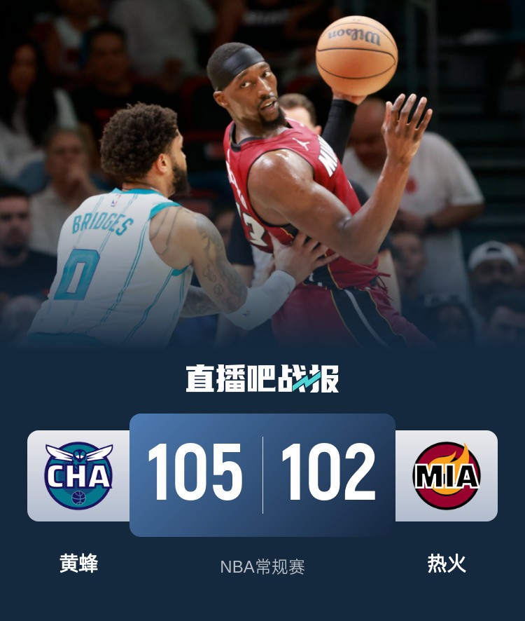 开场后热火在希罗、阿德巴约和维金斯三人合力发挥下迅速取得10优势,布里奇斯带队追分,维金斯接连砍分强势回应帮助热火保持两位数优势。第二节热火多点开花继续扩大优势,阿德巴约依旧在内线表现活跃,黄蜂还是靠着布里奇斯的发挥苦苦追赶,黄蜂在半场结束时追到只差6分。易边再战,黄蜂继续紧追不舍,马威在内线强势发挥,希罗带领热火守住微弱优势,最后一节鲍尔稍微找到一些状态带领球队追平比分,邓罗关键三分回应,但黄蜂势头起来后布里奇斯又是连续砍分,鲍尔也命中三分,黄蜂一举反超比分,阿德巴约投进三分续命,此后黄蜂失误,但热火最后绝平三分不中,最终黄蜂105-102逆转热火。