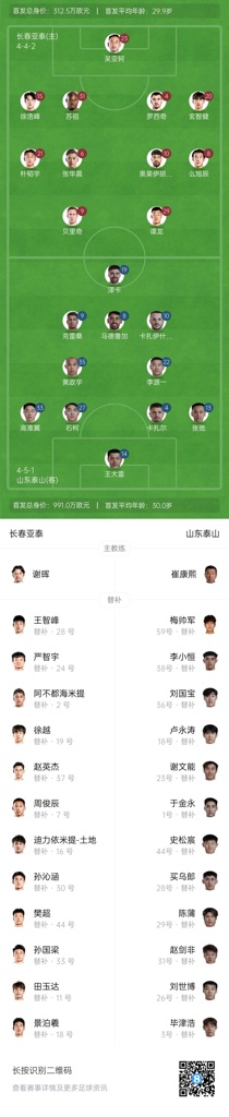 04月06日讯 4月6日15:30,中超第5轮长春亚泰对阵山东泰山。赛前,双方公布比赛名单。