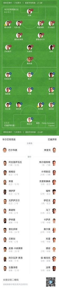 毕尔巴鄂首发:1-乌奈-西蒙、17-贝尔奇切、4-艾托-帕雷德斯、14-乌奈-努涅斯、18-德马科斯、23-豪雷吉扎尔、16-德加拉莱塔、10-尼科-威廉姆斯、20-乌奈-戈麦斯、7-贝伦格尔、21-桑纳迪