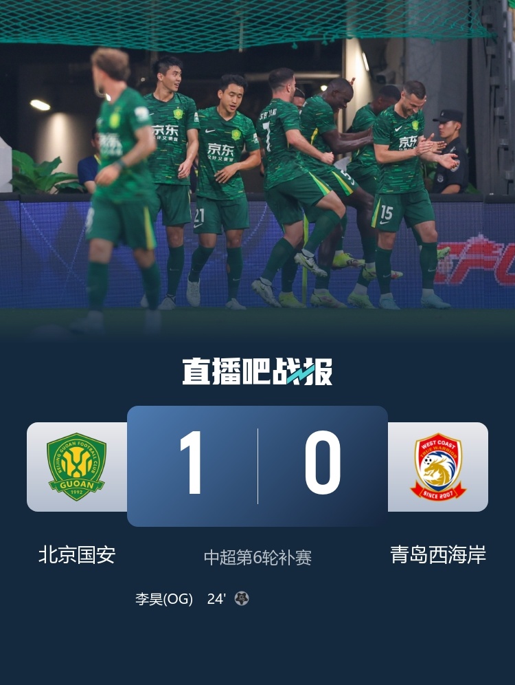 第24分钟,北京国安左侧角球机会,皮球开到后点,头球摆渡到小禁区前,恩加德乌头球攻门!皮球飞向球门,击中立柱后反弹,倒地的李昊不慎将球扑进自家球门!乌龙球!北京国安1-0领先青岛西海岸↓