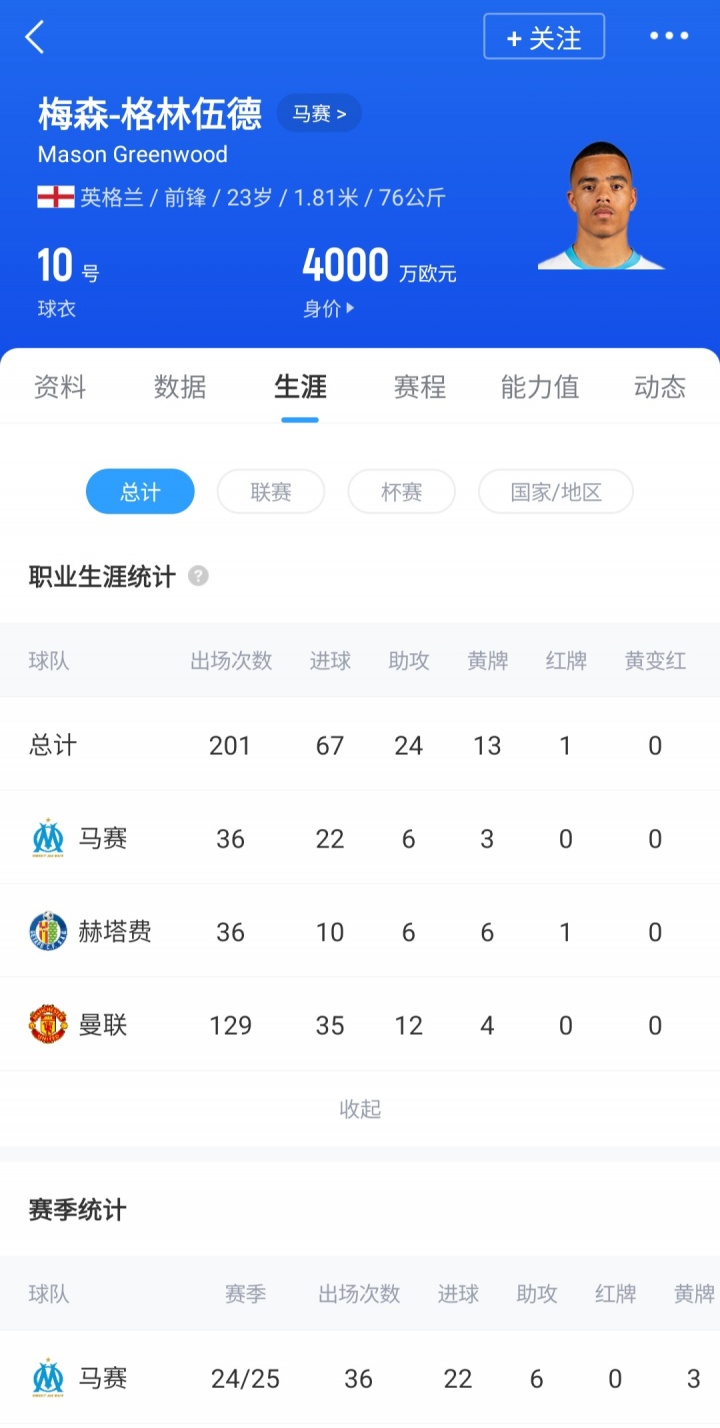 23岁的格林伍德,上赛季代表马赛出战36场比赛,贡献22球6助,目前球员德转身价4000万欧。