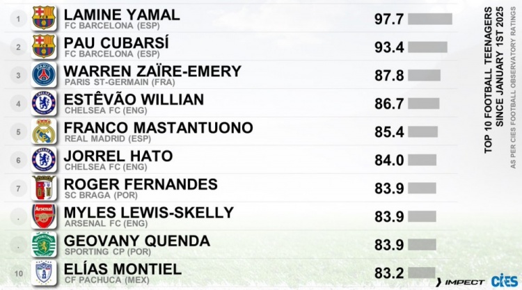 CIES评今年非门将U20球员表现:亚马尔、库巴西前二,斯凯利在列