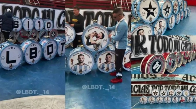 一些鼓背面还印有“Messi”字样或LBDT缩写,此外,还有四个鼓上印有马尔维纳斯群岛和国旗的颜色。他们还计划偷偷带入一些河床队颜色的传统鼓,但能否成功尚不确定。现场还将有一面新的横幅,上面写着“非常感谢队长”,一侧是酒瓶标志和14号数字,另一侧则是梅西亲吻奖杯的画面。