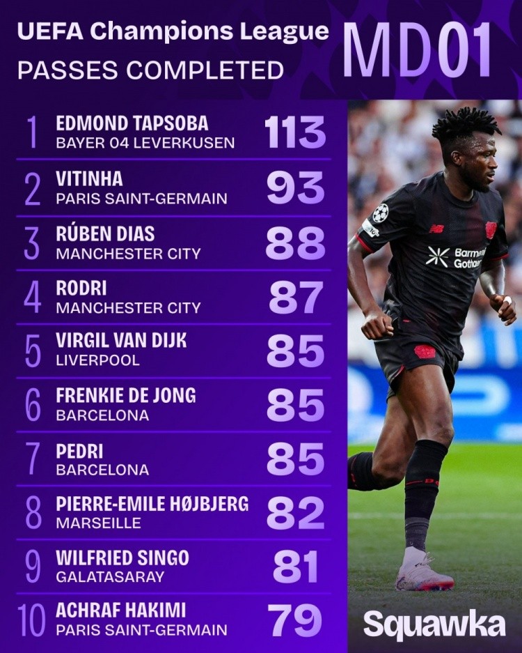 塔普索巴完成113次传球,是本轮欧冠唯一传球次数100+的球员