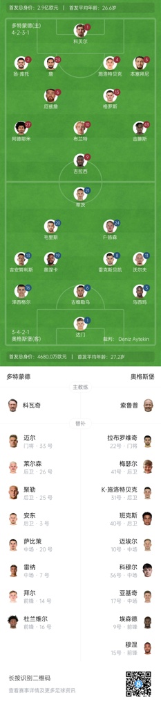多特首发:1-科贝尔、2-扬库托、4-施洛特贝克、5-本塞拜尼、6-厄兹詹、23-埃姆雷-詹、13-格罗斯、10-布兰特、9-吉拉西、27-阿德耶米、43-吉滕斯