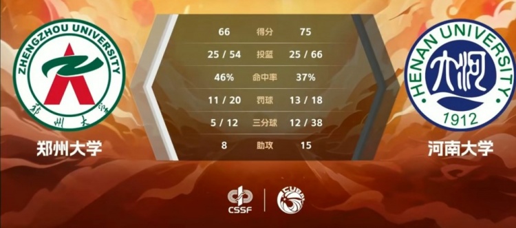 第四节,王跃华5犯离场,使得本就只有6人轮换的郑大雪上加霜,河大罚球再获两位数优势,张晶瑶也5犯离场,王琰三分射停河大,李文宇三分稳住局势,赵唐潼失衡高打板命中,郑大打成2+2延续希望,河大内外开花连得7分锁定胜局。最终,河南大学75-66力克郑州大学。
