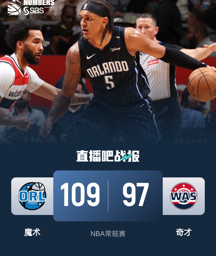 班凯罗33+18+8 小瓦格纳27分 卡林顿新高32+9+7 魔术击败奇才