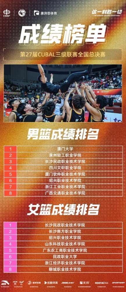 6月10日,第27届中国大学生篮球三级联赛全国总决赛圆满落幕。男篮方面,中国澳门大学以3分优势险胜泉州轻工职业学院,问鼎三级联赛男篮全国总冠军!长沙民政职业技术学院荣获全国季军。
