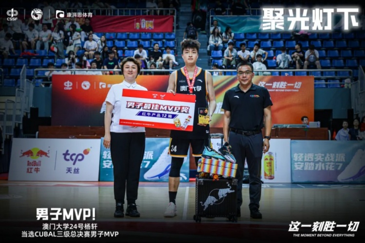 在今日举行的男子篮球总决赛巅峰对决中,客场作战的中国澳门大学凭借核心球员24号杨轩的统治级表现,以3分的微弱优势力克泉州轻工职业学院,勇夺冠军!杨轩全场独揽22分并摘下15个篮板,成为球队制胜的关键。进攻端,他火力全开:内线中距离投篮9投5中,展现稳定手感;外线更是四记三分穿心,成为撕裂对手防线的利刃,成功击垮了对方的防守体系。 15个篮板的数据不仅彰显了他出色的篮下控制力,更一次次映衬着他在场上不知疲倦飞奔拼抢的矫健身影。杨轩在攻防两端的全面爆发,无疑是中国澳门大学捧杯的最大功臣!