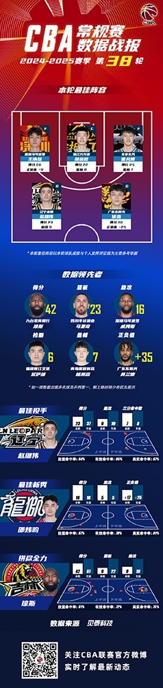 数据领先者方面:吉林东北虎男篮球员多米尼克-琼斯以单场42分的数据领衔得分榜;