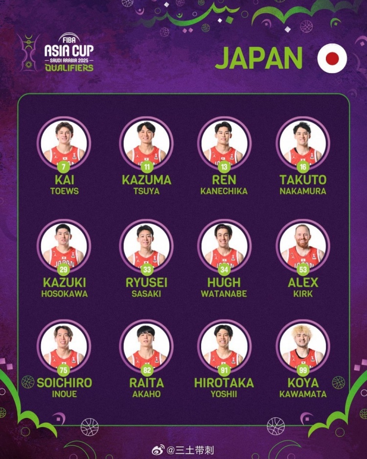 FIBA官方列出了日本男篮明日比赛的12人大名单,具体如下: