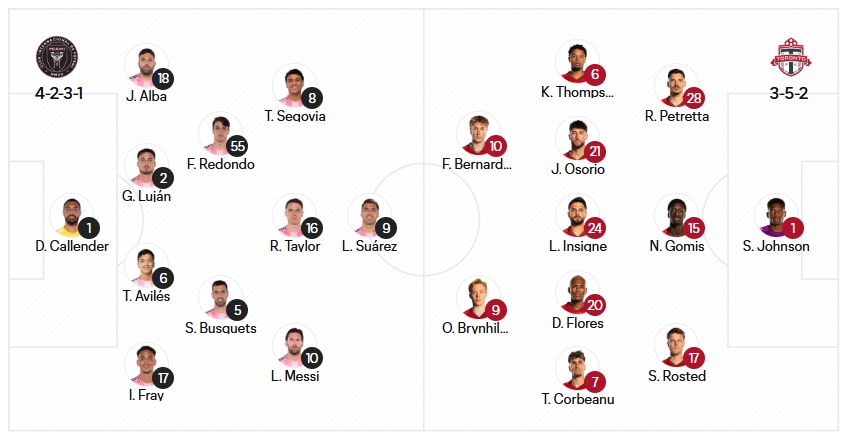 迈阿密国际首发:1-卡伦德、17-伊恩-弗雷、6-阿维莱斯、2-卢扬、18-阿尔巴、5-布斯克茨、55-雷东多、16-罗伯特-泰勒、10-梅西、8-特拉斯科、9-苏亚雷斯