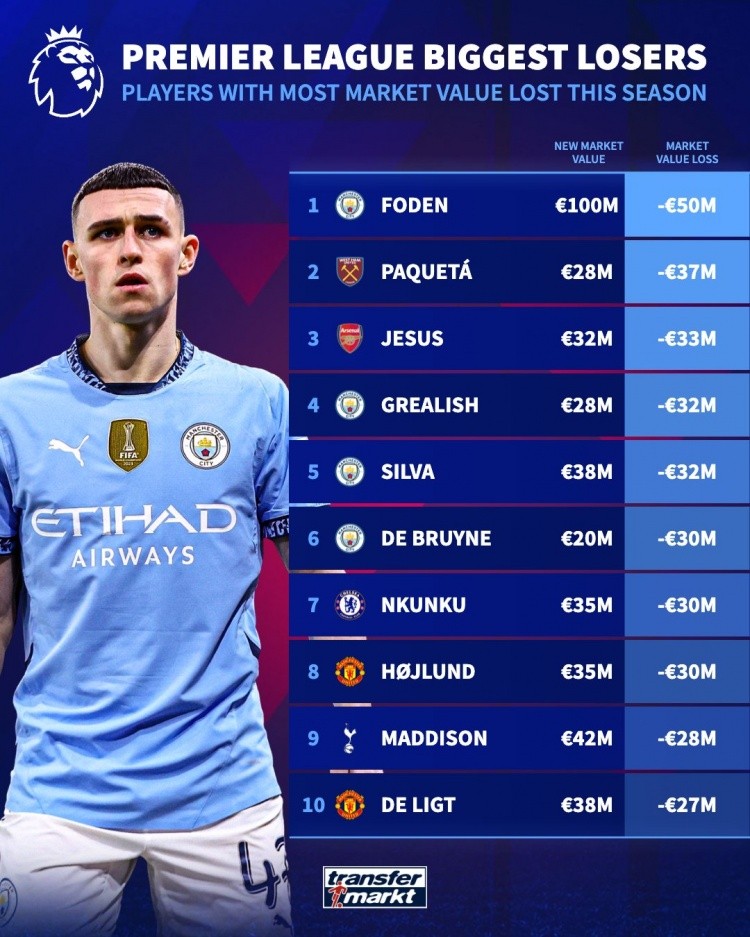 本赛季英超身价下滑榜:福登下滑5000万欧最多,前6曼城占4席