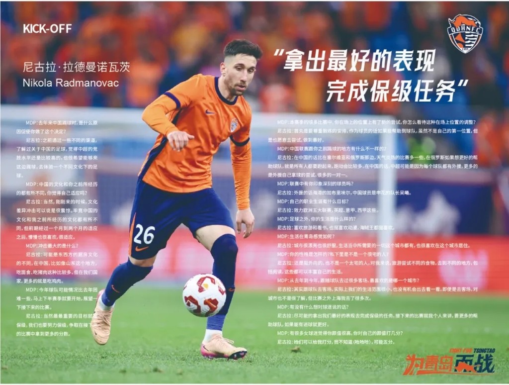 06月26日讯 青岛海牛本期赛刊,青岛海牛外援尼古拉-拉德马诺瓦接受俱乐部专访,球员谈到了自己对于中超的看法,以及自己日常生活的一些感受。