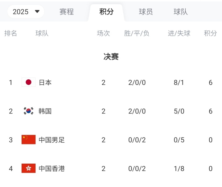 积分榜上,国足和中国香港分列3/4位,国足以净胜球优势排名靠前。末轮日韩还将正面对决决出最后的冠军,比赛时间是18:24,也将免费视频直播这场比赛。