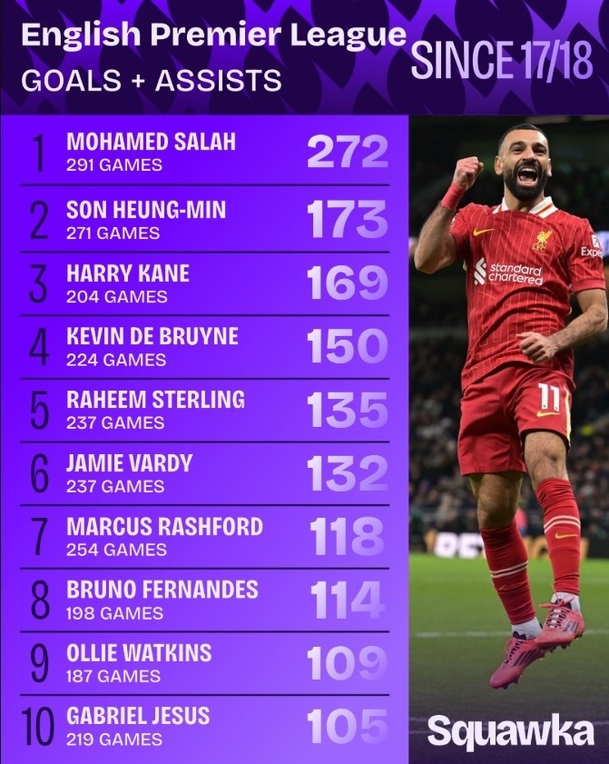 9月9日讯 2017年加盟利物浦以来,萨拉赫在进攻端展示出了极高的效率。根据Squawka的数据统计,埃及边锋共出战291场英超比赛,直接参与272球,同期断层领先。