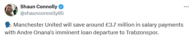 记者表示:“奥纳纳即将租借加盟特拉布宗体育,曼联将从这笔外租交易中节省约370万英镑的薪水开支。”