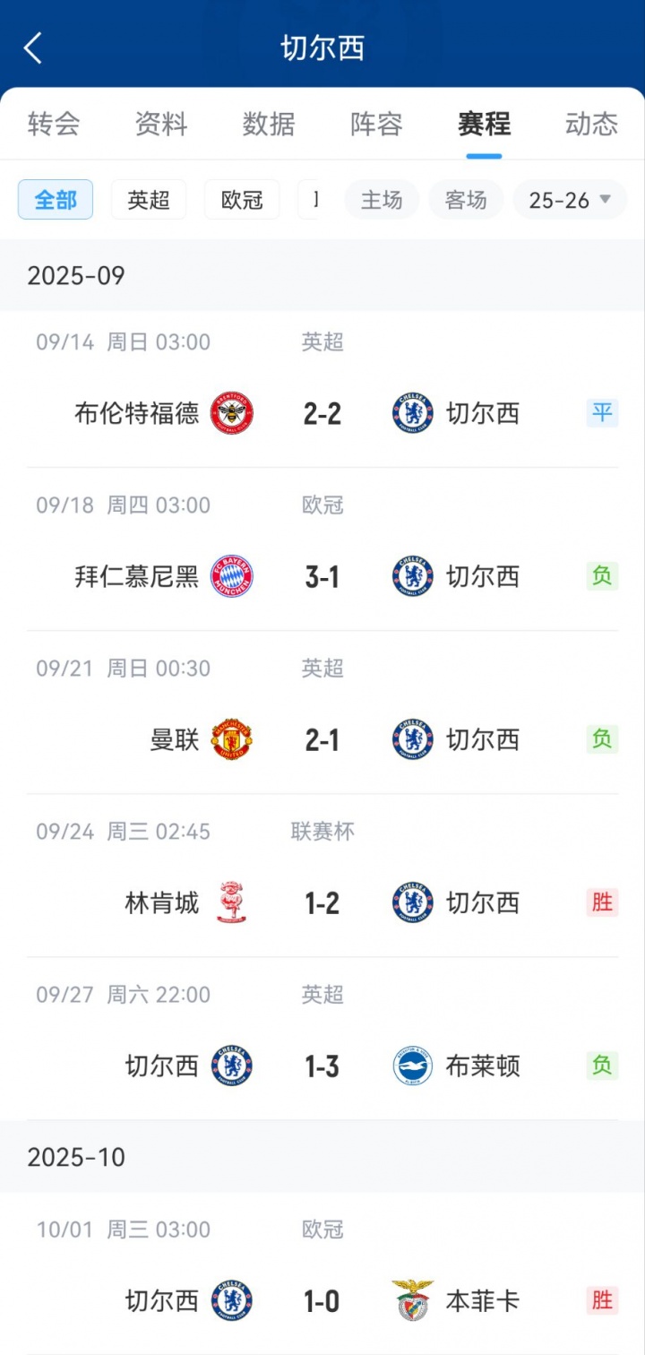 9月进行的各项赛事中,切尔西收获1胜1平3负,仅在联赛杯中2-1战胜了英甲球队林肯城;他们对阵拜仁的欧冠比赛,对阵曼联、布莱顿的英超比赛均不敌对手。包含周中切尔西1-0本菲卡在内的几场比赛中,蓝军门将桑切斯、后卫查洛巴、前锋佩德罗分别吃到红牌。