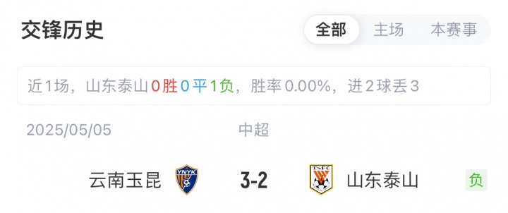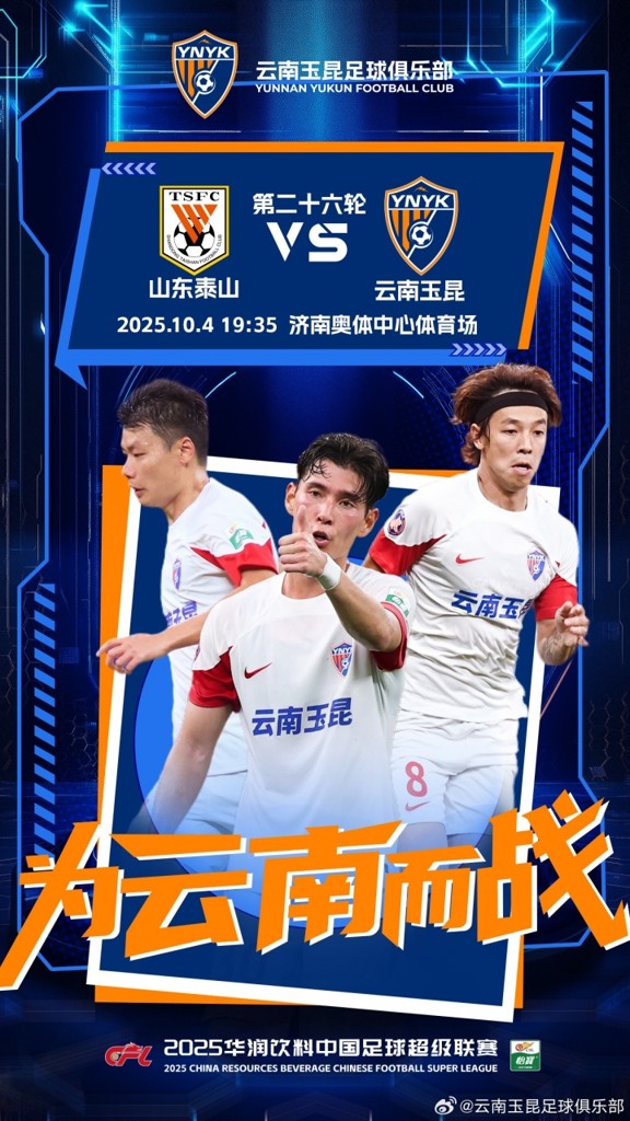 目前,山东泰山12胜6平7负积42分位列中超第6,近6轮比赛泰山4胜2平保持不败;云南玉昆8胜7平10负积31分位列中超第10,球队近期3负2平连续五轮不胜。本赛季双方首回合比赛,泰山遭玉昆让二追三逆转。