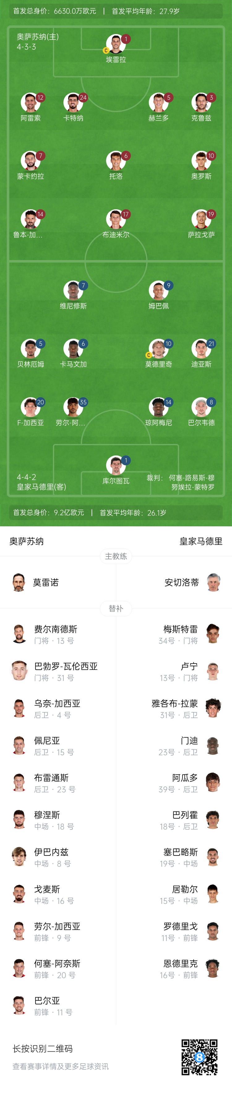2月15日讯 北京时间23点15分,西甲第24轮,奥萨苏纳vs皇马,赛前首发公布。